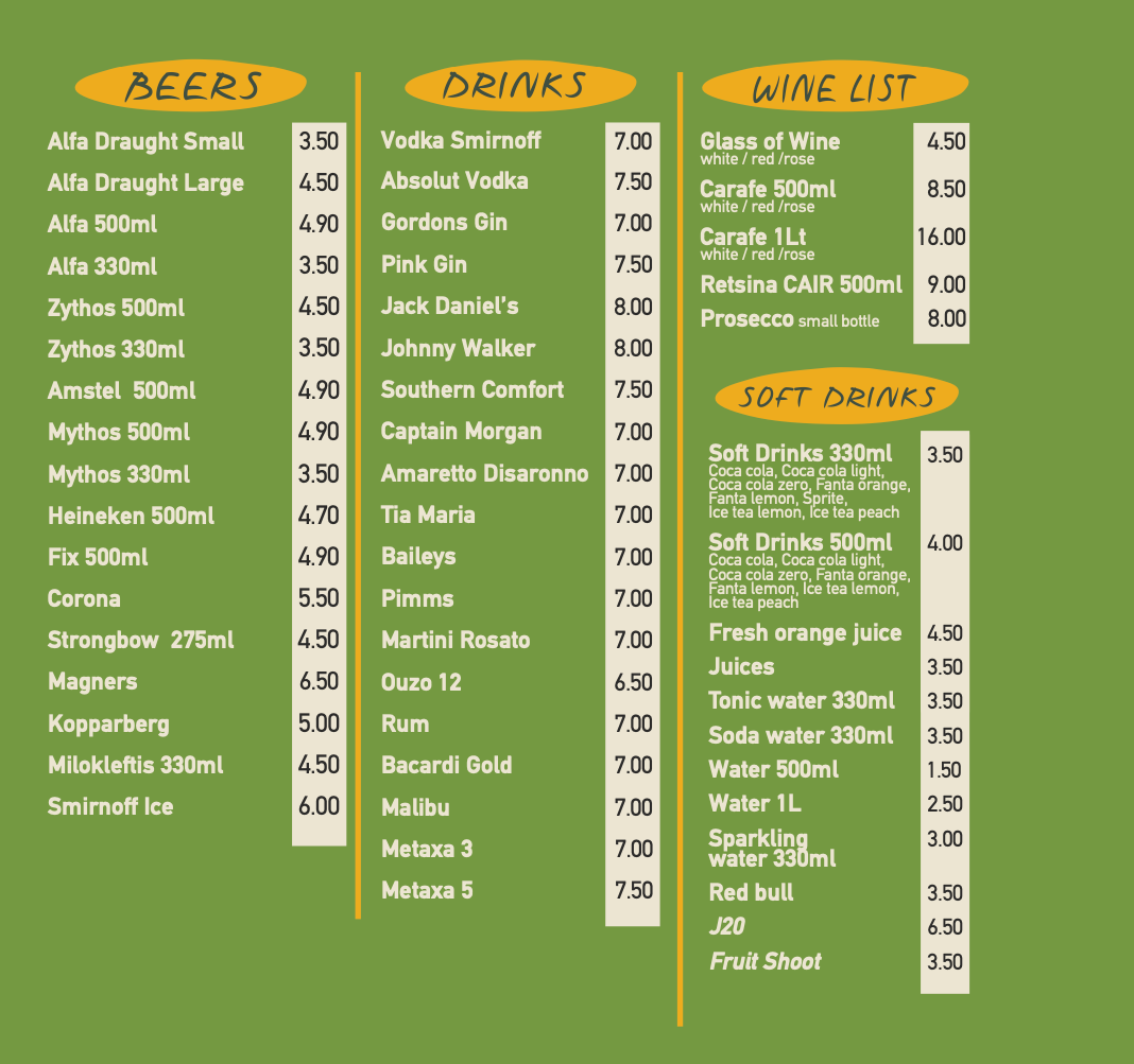 Here you will find takeaways based in Pefkos and then below you will find the Food tolerance/dietary requirements at the bottom of this page.